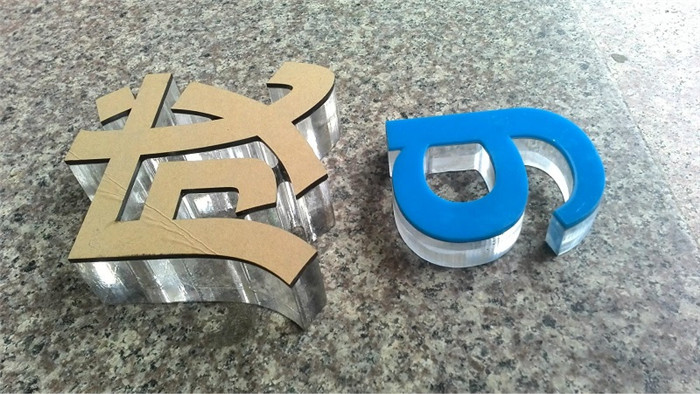 一般是雙層的亞克力制作,下面是透明的亞克力(一般厚度有5mm,8mm, 10mm), 面板是3mm厚的帶顏色亞克力。采用粘合方法連接在一起,從側方看有水晶的效果,俗稱“水晶字”。