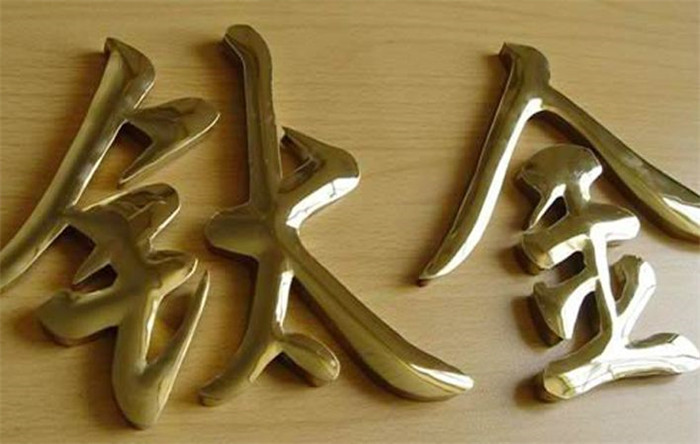 銅字。仿古銅字,銅牌,有鐵字的優點外,還有個特別就是不會生銹,當然它的顏色只有一種,即金黃色字。給人感覺富麗堂皇、很威嚴。許多政府單位用得多,像外樓的字、門牌、行政牌等。銅,亦是較易氧化的金屬,因此人們常將它進行電鍍或完成字形加工后將表面拋光處理,再做封閉漆(防銹),使其金光閃閃。