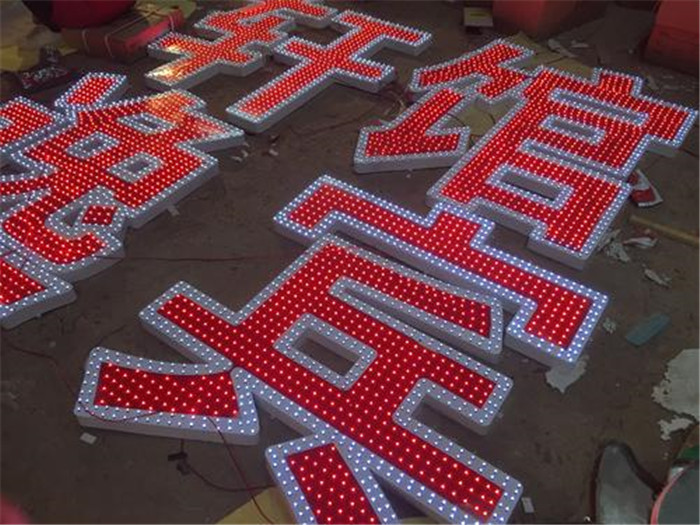 外露發光字平面和圍邊與普通發光字一樣,也叫沖孔字,唯一不同就是光源,它是由小的圓點LED燈珠,鋪滿字的面板上。