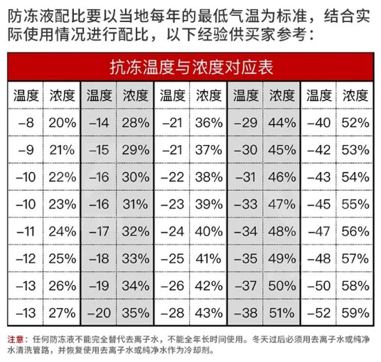 2、配比:零下20度以上建議濃度35%,零下30度建議濃度45%,零下40度建議濃度52%。具體的溫度和濃度參照表如下圖: